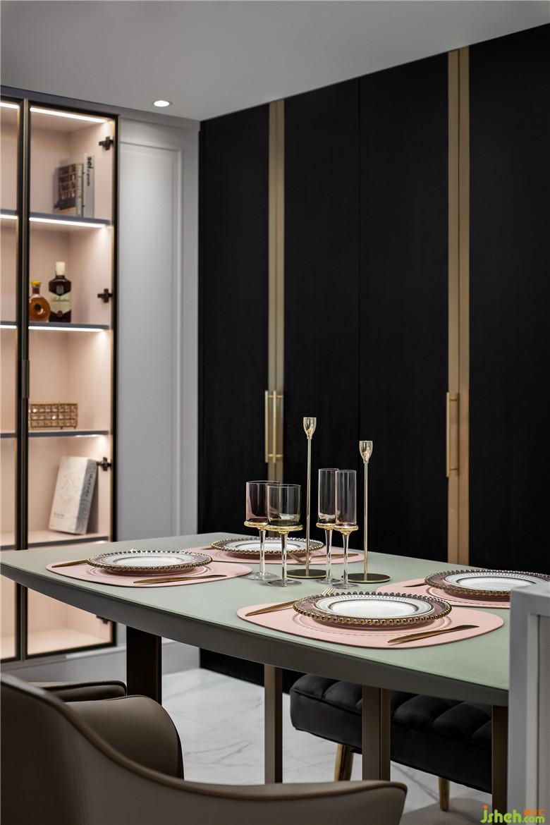 · 餐廳的中島設(shè)計(jì),裝修公司提高了空間互動(dòng)性,也大大增加了操作臺面和儲物空間,方便又實(shí)用!玻璃展柜擺滿Mini喜歡的小物件,燈光采用燈帶與射燈的結(jié)合,讓不同元素構(gòu)成震撼反差。