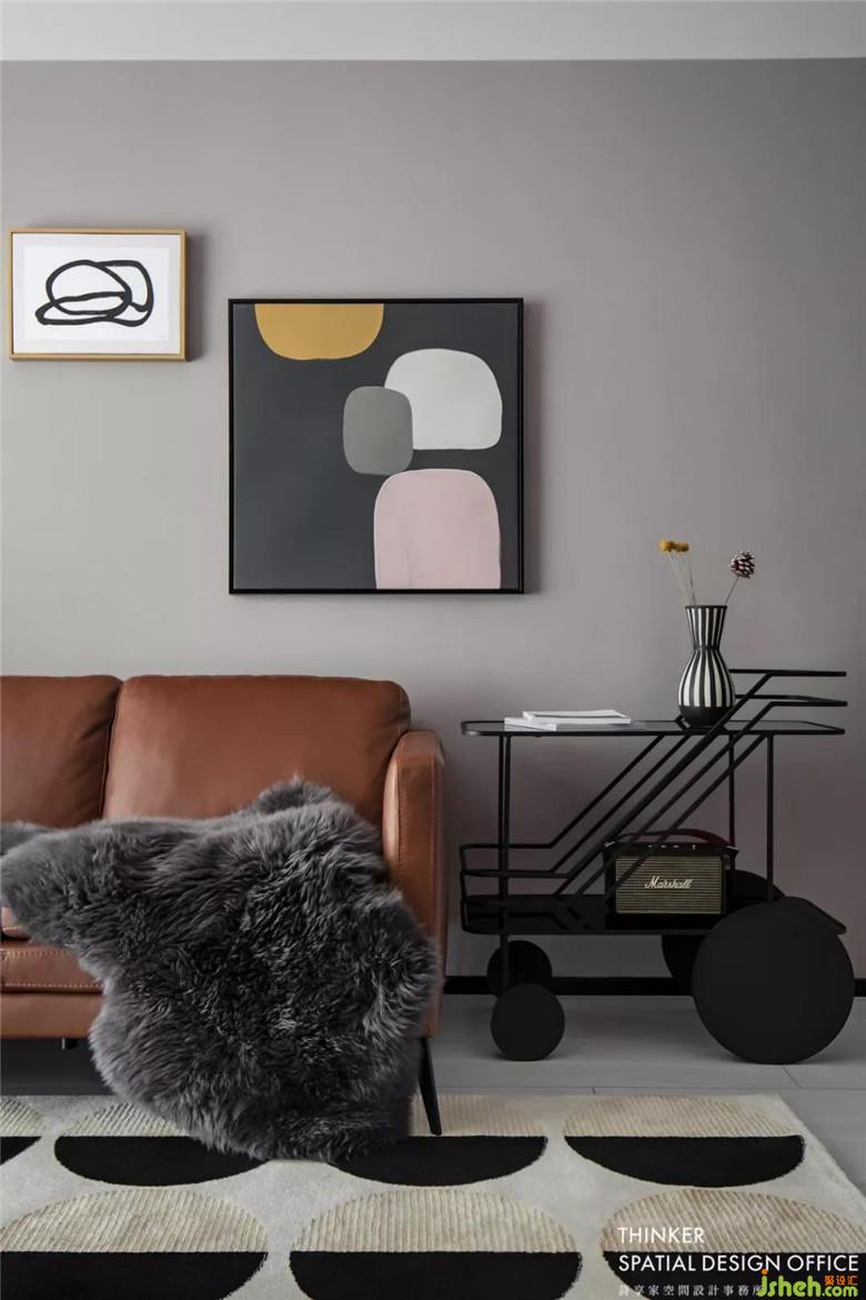 客廳沒(méi)有大型的收納柜,而是用極具設(shè)計(jì)感的邊幾、推車來(lái)代替,藝術(shù)而靈動(dòng)。