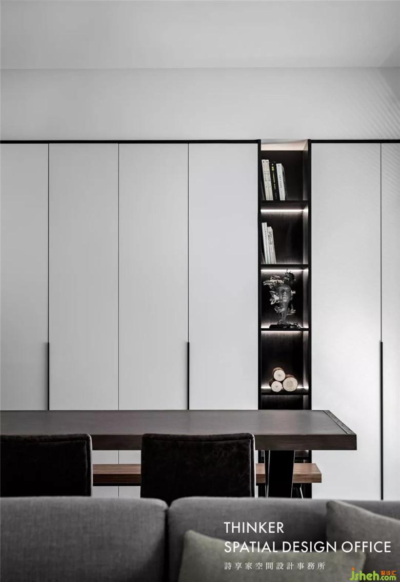 餐桌后方是極簡的收納柜,極簡卻不簡單,雅而不俗,僅以藝術品與幾處精細花瓶點綴,卻足以點亮整個空間。