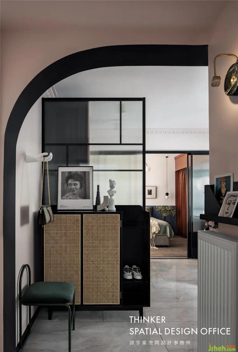 裝修公司借用一點客廳的位置規(guī)劃出一個玄關(guān),方便放置常用的包包,鞋子等小物,Joe特別選了一款藤編柜,老物件的年代感,往往也是時尚的一部分。