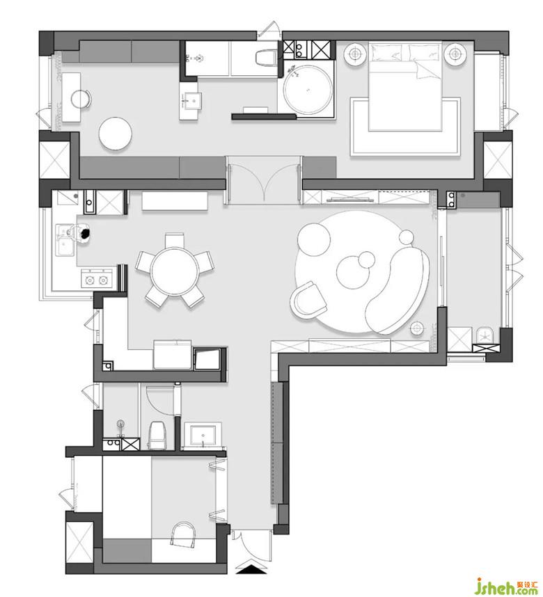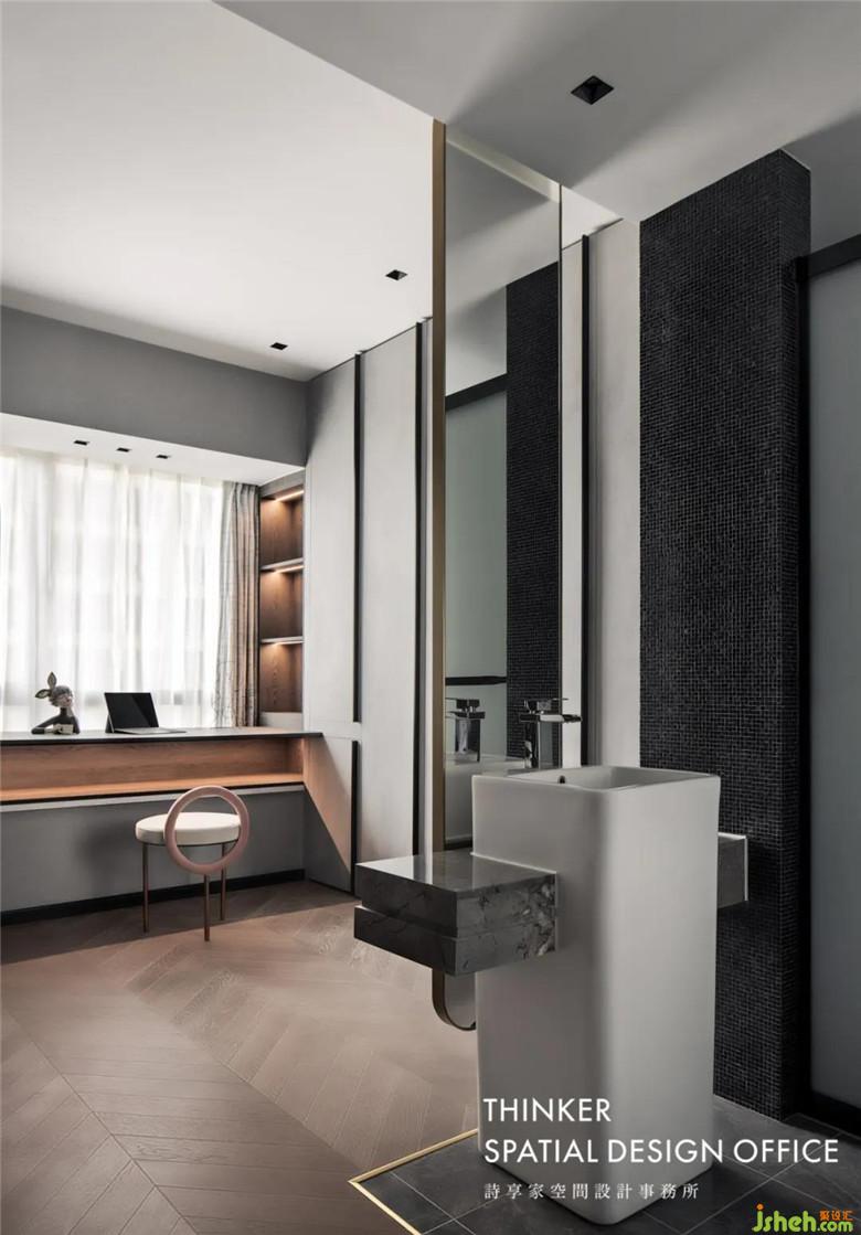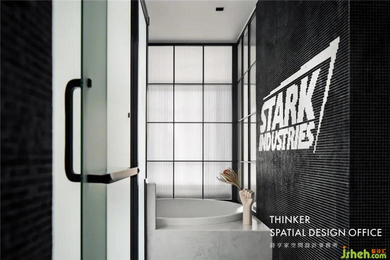 臥室和衛(wèi)生間在劃分區(qū)域的時(shí)候,用黑框玻璃做隔斷,玻璃的通透,加上鐵的金屬質(zhì)感,讓空間顯得更加寬闊,也更加時(shí)尚。