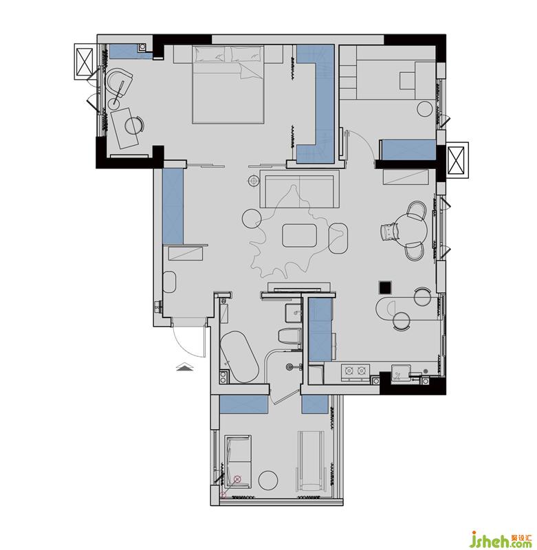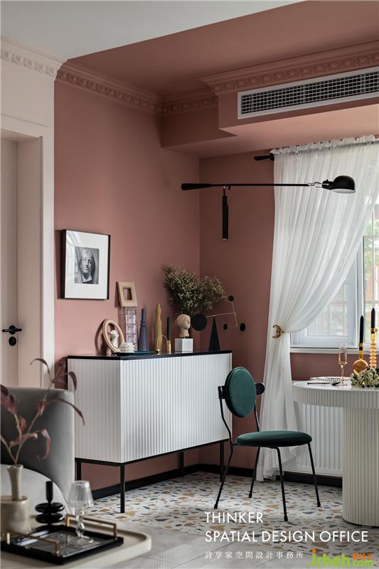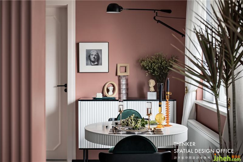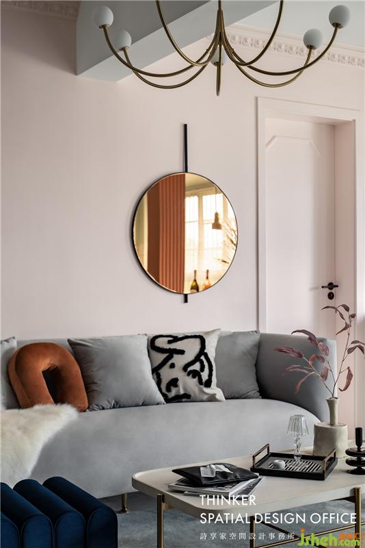 · 經(jīng)典的灰粉配色讓空間顯得年輕有活力,而材質(zhì)的質(zhì)感則很好地烘托出色彩的表現(xiàn)力,再點綴少量的寶藍(lán)和黑色,更顯時尚。