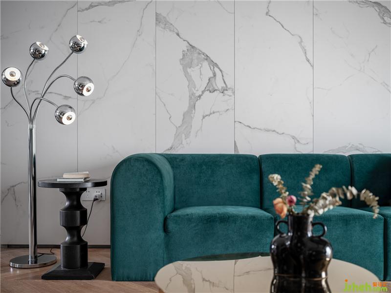 背景墻為獲得流暢自然的花色圖案,專門拍攝石材,再模擬切割、拼圖,反復(fù)試驗(yàn),獲得滿意效果后再按圖施工。中間拼接的處理方式,小面積巖板藏在沙發(fā)后,節(jié)約了材料和預(yù)算。