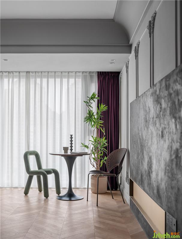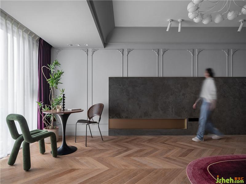 家居設(shè)計(jì)背景墻采用PU線條,營(yíng)造護(hù)墻板高級(jí)效果。局部水泥灰藝術(shù)漆、拼接金屬材質(zhì),打造藝術(shù)體塊,質(zhì)感十足!Jean夫婦兩都沒有看電視的習(xí)慣,于是舍棄電視,打通陽臺(tái)與客廳,打造時(shí)髦讀書角。