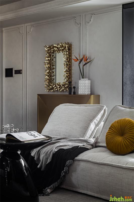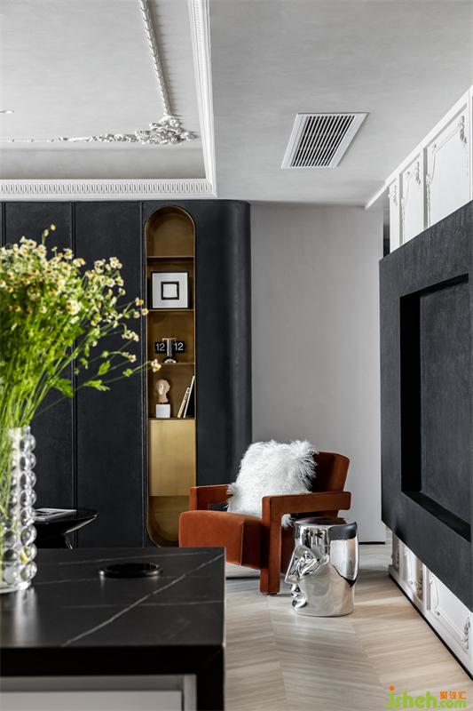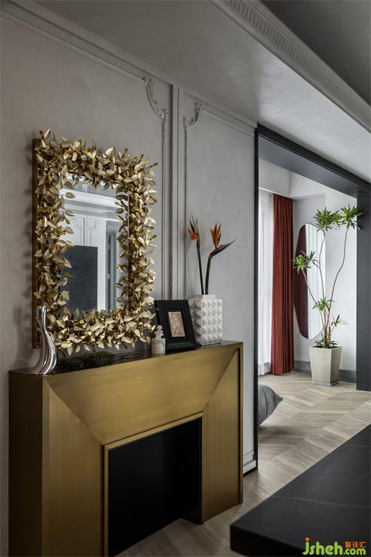 客廳往餐廳望去,金屬制成的壁爐形成空間區(qū)隔。20cm深的壁爐,輕盈不占空間,臺(tái)面上可以擺放香薰、花瓶等小物件。壁爐和鏡子同樣采用金色材質(zhì),更添精致感。
