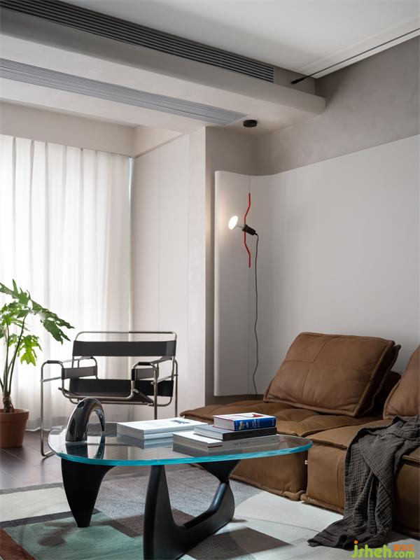 陽(yáng)臺(tái)納入客廳,經(jīng)由半透未透的紗簾過濾后的自然光落入室內(nèi),光影明暗的變化,為客廳帶來十足的韻律感。正如安藤忠雄所言:“自然光被恰當(dāng)?shù)囊脒M(jìn)來,平凡的物質(zhì)也就有了生命力。”
