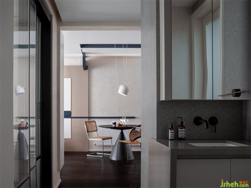 廚房墻面局部拆除,以開放形態(tài)展開。以玄關(guān)為開端設(shè)計(jì)出吧臺(tái),餐后在吧臺(tái)處小酌閑飲,將屋主向往的閑適生活進(jìn)行具象化表達(dá)。