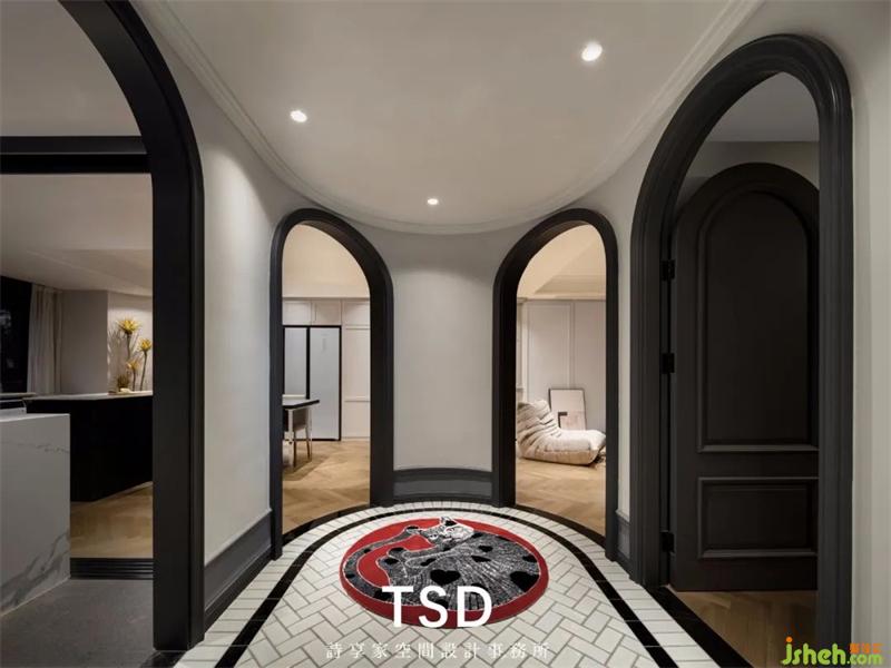 入戶的空間通過拱形門洞延伸開來,踏入此間,視線穿過門洞,觸達多個區(qū)域。由于沒有實在的空間阻隔。視線隨區(qū)域的變化而變化,展現(xiàn)出了不拘一格的自在感。