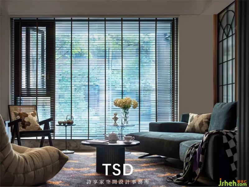 大扇落地窗框住了寧靜自然的窗景,光線自然地透過百葉簾灑在客廳,光影游移,時光由抽象變得具體。