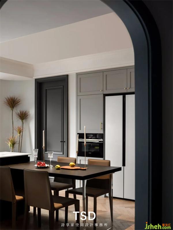 咖灰色的收納柜有藏有露,低飽和灰調(diào)與香草白的經(jīng)典配色,契合法式的優(yōu)雅韻味。柜體上精致流暢的弧線,呼應(yīng)玄關(guān)區(qū)線條元素。輕奢黃銅做柜門把手,于無聲中增加空間復(fù)古質(zhì)感,兼顧實用性及設(shè)計美感。