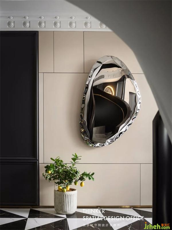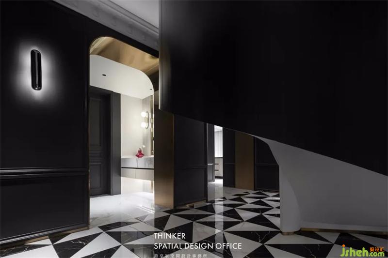 站在門口,透過玄關(guān)境的視線,我們馬上就能感受到設(shè)計(jì)師想要空間呼應(yīng)的想法。拼花地磚呼應(yīng)著旋轉(zhuǎn)樓梯,雕花立柱在現(xiàn)代設(shè)計(jì)中點(diǎn)綴出法式優(yōu)雅,而同時(shí),它們又自成一體地營造出樓梯廳的空間感。設(shè)計(jì),就該是一種系統(tǒng)而整體性的考量。
