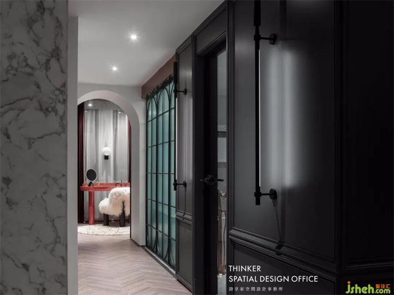 走廊連接著臥室,衣帽間和主衛(wèi),功能區(qū)明確而互不干擾。長虹玻璃墻讓光更通透,而復(fù)古的鐵藝設(shè)計(jì),也讓人不禁去猜測,衛(wèi)生間一定內(nèi)藏什么小心機(jī)~