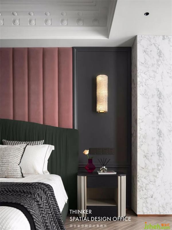 大戶型采光很棒,設(shè)計(jì)師可以大膽地選擇質(zhì)感更好的深色系材質(zhì)。從一樓到二樓,大面積的深灰色護(hù)墻板,給家更好的穩(wěn)定性,天鵝絨軟包與床頭材質(zhì)呼應(yīng),再用水晶燈做明度點(diǎn)綴,設(shè)計(jì)師在這樣的空間中,探尋更豐富的層次感。
