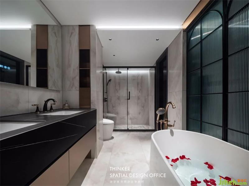 走進(jìn)主衛(wèi)的第一印象,是“秩序”。哪怕這個(gè)空間中有著太多的流行元素:懸空柜體、巖板臺(tái)面、不銹鋼壁龕、大理石淋浴間、長虹玻璃隔斷......
