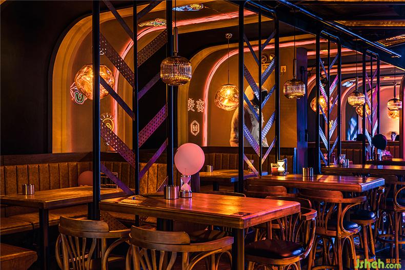 挑高的吹拔酒墻陣列而吸睛一探究竟使觀者為之驚訝。酒吧設計