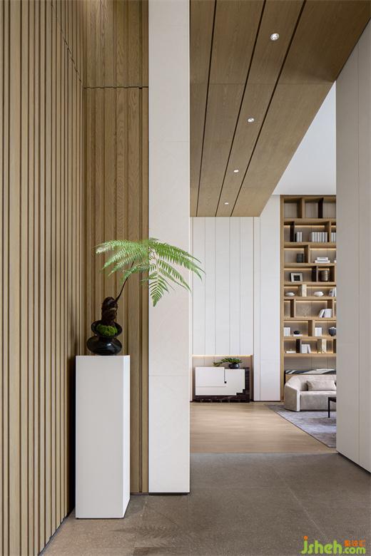 會(huì)客廳書吧隨形而制,空間開合有度,并無(wú)過(guò)多的裝飾,墻立面通高縱向木紋凹槽肌理與石材豎向條紋互為呼應(yīng),柏悅公館會(huì)所設(shè)計(jì)以空間序列的美學(xué)力量彰顯待客空間儀式感。書吧入口正對(duì)一小方端景,白色及山水紋石材以不規(guī)則幾何體塊穿插咬合,與會(huì)客廳現(xiàn)代金屬幾何端景互為借景,將傳統(tǒng)與當(dāng)代、東方與西方藝術(shù)元素于空間中巧妙融合。