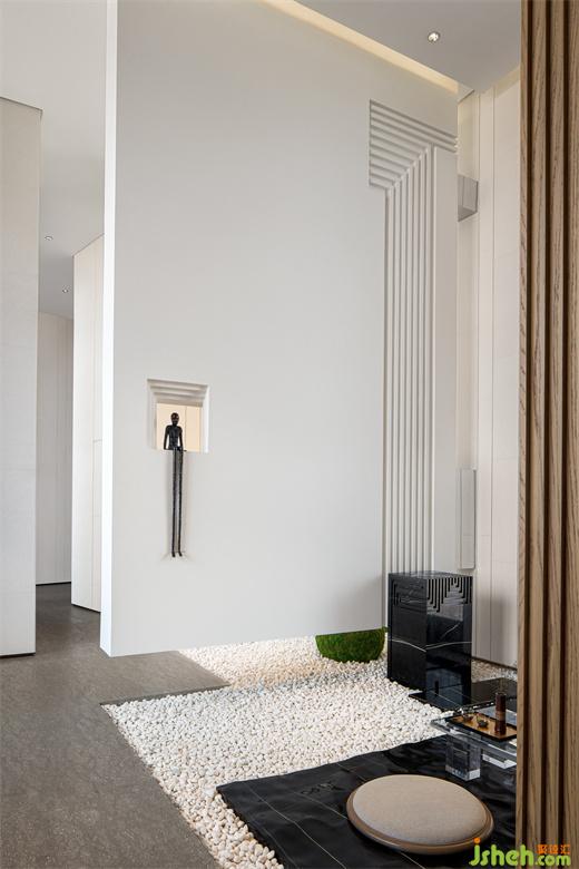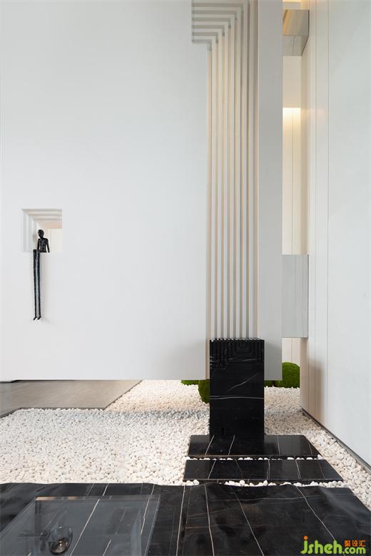 處處鄰虛,方方側(cè)景,旁側(cè)開鑿的一面方形漏窗延續(xù)空間中的幾何線條力量,從廊道另一側(cè)看過(guò)來(lái),柏悅公館會(huì)所設(shè)計(jì)以洞開的窗口構(gòu)圖空間,端臺(tái)上相對(duì)而坐的雕塑藝術(shù)品顧盼之間彼此呼應(yīng),緘默萌趣。