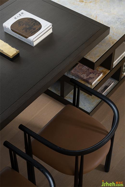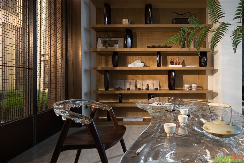 詩意空間設(shè)計嘗試從詩詞及文學(xué)意象中汲取靈感,營造當(dāng)代東方的空間詩性表達,茶室端景一株清靈的水橫枝盆景,柏悅公館會所設(shè)計映襯著橫紋墻布上的隱隱光澤,意境清逸幽淡,點染成一處幽美婉約詞境。