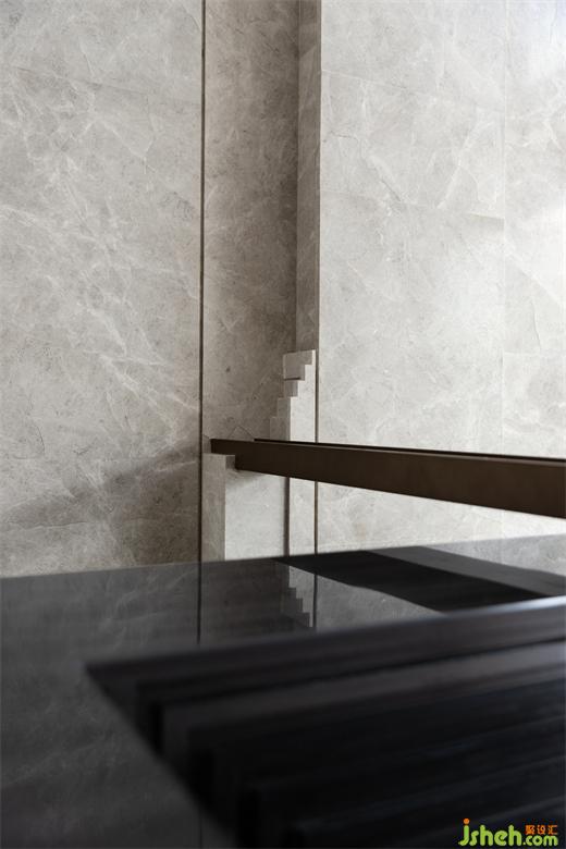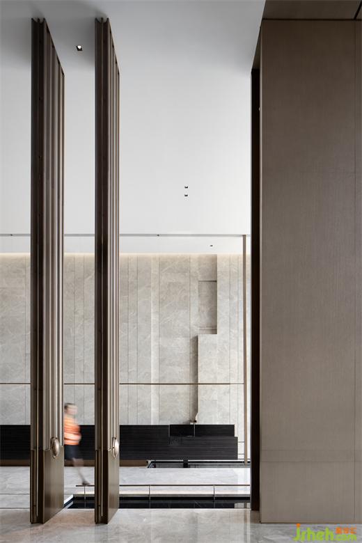 步行穿越室外嶺南園林意境的山重水復(fù),接待區(qū)筆直的幾何線條與淡雅的灰色木紋石材交織出一派寧靜深遠(yuǎn)。借助豎向且有韻律的線條將立面灰色木紋石材縱向鋪排,包裹黑色木紋石材的長(zhǎng)條接待臺(tái)延伸著空間尺度。