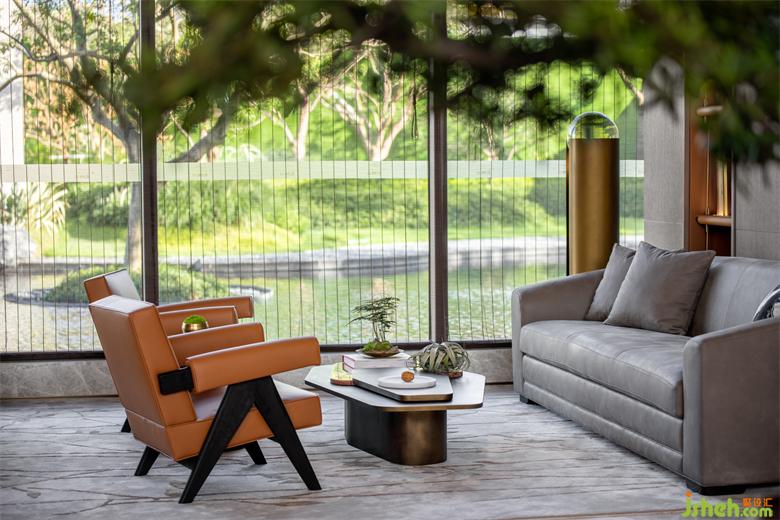 落地窗戶收納著園林水景的影影綽綽,小小方寸圍合出一個安靜的空間,坐在這里看書、喝茶或是賞玩,跟隨自己的節(jié)奏感受窗外的四季流轉(zhuǎn)。