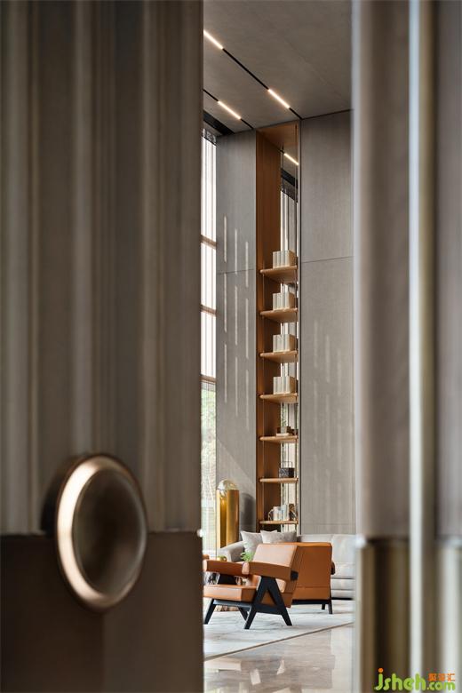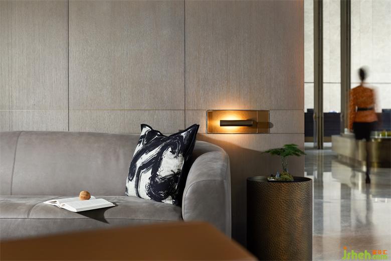 落落高大的溫潤淺灰色木紋,點綴古銅金屬藝術(shù)燈具,水墨靠枕喚醒了赭石色與灰色皮革沙發(fā)的溫雅。同色系手工錘紋金屬圓形邊幾,襯一棵單株南天竺,安靜而純粹,靜靜感知當(dāng)下的勃勃生機(jī)。