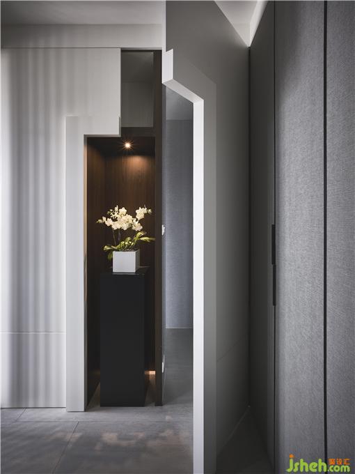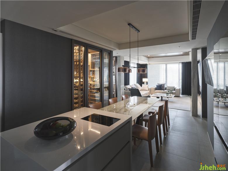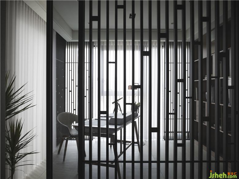 本案隱藏於玄關後方的隱藏衣帽間,利用衣帽櫃凹洞達到展示機能,成為入門端景。推開左側格柵門片,一處進門後可稍作沉澱的多功能書房,窗面兩端同樣以不規(guī)則寬窄線條交錯的格柵屏風營造寧靜感,當日光灑落即形成有趣的光影律動。具透視感的鍍鈦櫃體既是書櫃,也是界分區(qū)域的造型屏風,更拉伸了沙發(fā)背牆的尺度,成就完整大器的客廳。緊鄰客廳的開放式餐廚,運用結構柱的深度延伸出酒窖,餐敘場域在穿透開闊的空間,細細品味生活。裝修公司