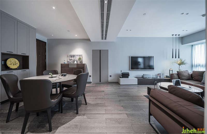 餐廳形式上化繁為簡,整個餐廳空間采用濃淡結(jié)合的同色系。室內(nèi)設(shè)計師