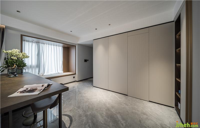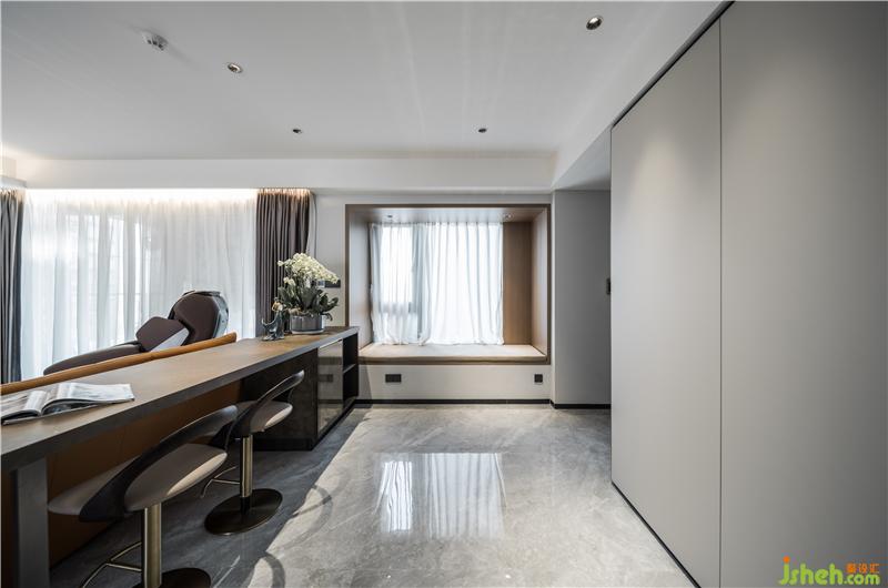 巖板做的吧臺(tái)無形中給人心理上做了區(qū)域劃分,作為休閑吧臺(tái)的同時(shí),也是一個(gè)視覺緩沖半隔斷,使坐在客廳的人,心理上有一個(gè)穩(wěn)定的感受。旁邊的飄窗,用木飾面包裹起來,溫潤(rùn)的木質(zhì)觸感,拿一本書,隨時(shí)隨地可以舒適地躺在上面看云卷云舒,霞光變幻。