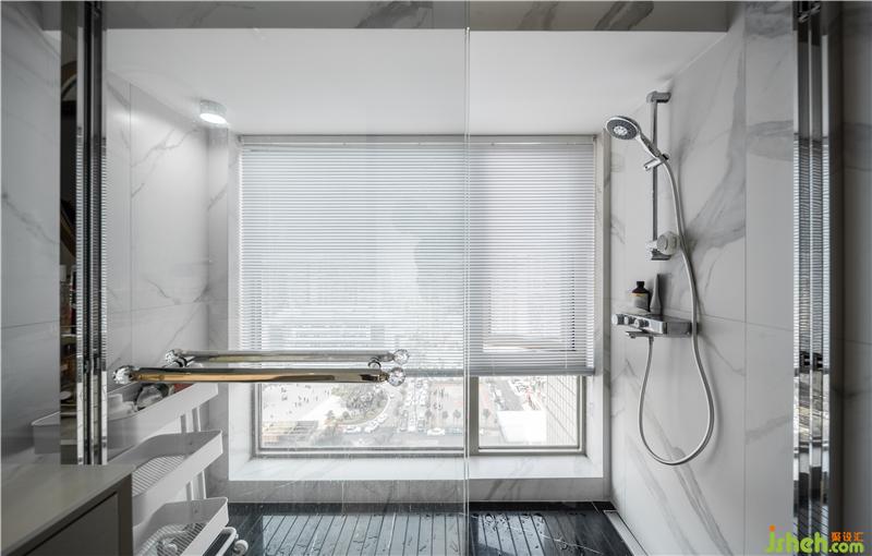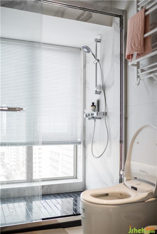 將衛(wèi)生間一分為二,干濕分區(qū)。所以使用半隔斷玻璃阻隔,讓動(dòng)線更為順暢的基礎(chǔ)上,視野更加通透,光線充足。