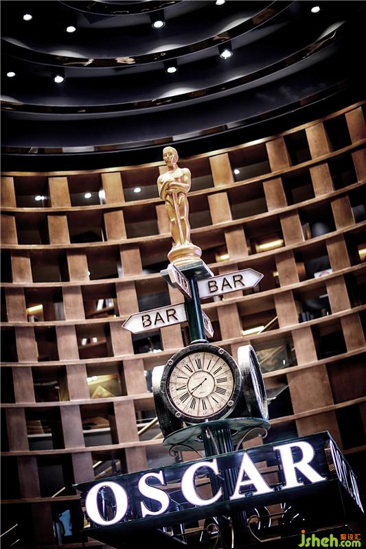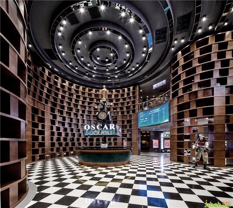 本項目位于一座商業(yè)廣場的三樓,是奧斯卡院線在鄭州的旗艦店,擁有一個兩層空高的前廳,介于規(guī)則與混亂之間的弧形展示墻背后隱藏著一個夾層結(jié)構(gòu),一樓是書吧與休息區(qū),二樓是一個電影主題餐吧。圓形前廳地面的黑白格子鋪裝看似簡單,卻是在古羅馬時期就已存在的鋪裝紋樣,它們與弧形景墻隨機(jī)的沖撞,迸發(fā)奇幻的視覺火花。圓形中島上方蒸汽時代的鐘塔與路標(biāo),以及頂端緩慢旋轉(zhuǎn)的小金人,彷如古老的中央車站,由此開啟一段兩小時的時空之旅。