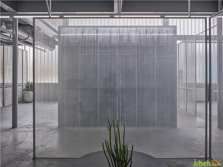 ▲接待區(qū)墻面背部,隱約可見的渲染色塊,像一幅安靜但極具張力的抽象畫作。