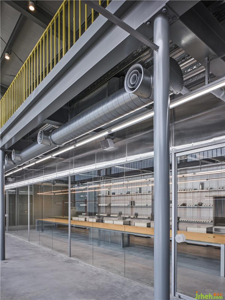 ▲訂制紅色燈具在一片機械色彩中,成為亮眼新穎的設計線條。