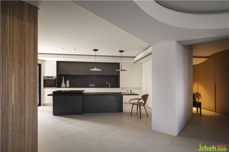 一室霧色,開放廚房的石墨色中島成了錨定色域?qū)哟蔚臐饽?