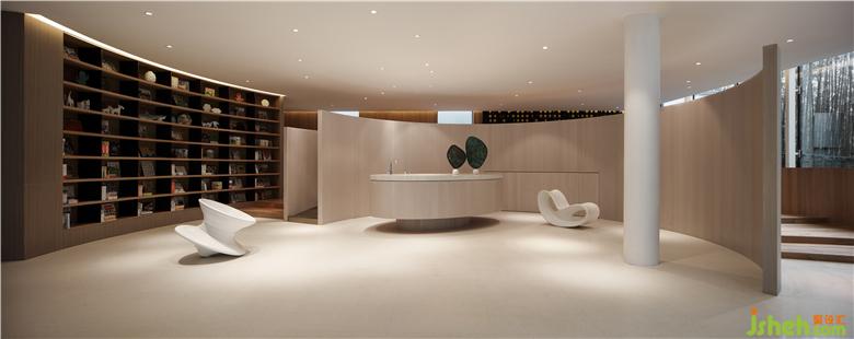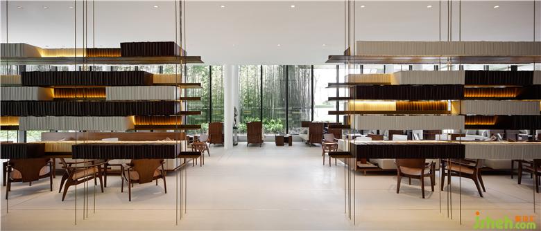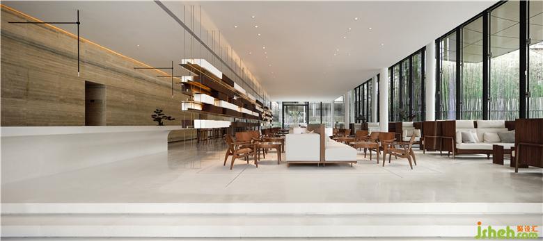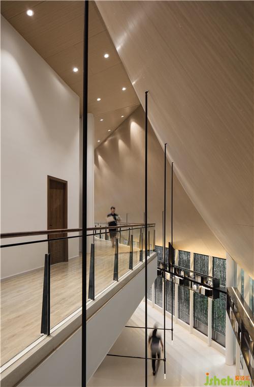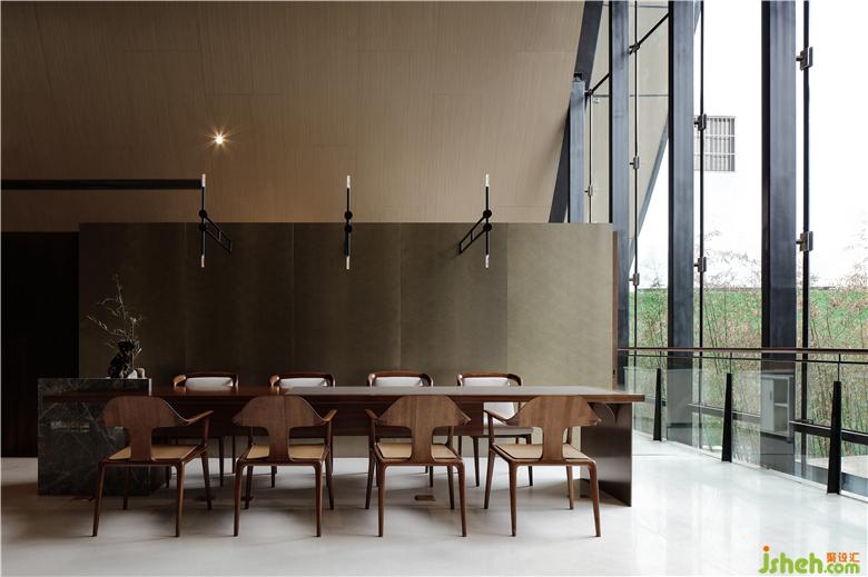 Black and gray steel bars form the spine of the rooftop, stretching and undulating like rolling mountains. Combined with the wide pool on the ground, a visual image of landscape painting is in sight. Transparent glass curtain wall interacts with reflections of clouds and lights in the water, creating a fascinating view and bringing spiritual peace of “A breeze produces no ripples”.售樓處設(shè)計(jì)