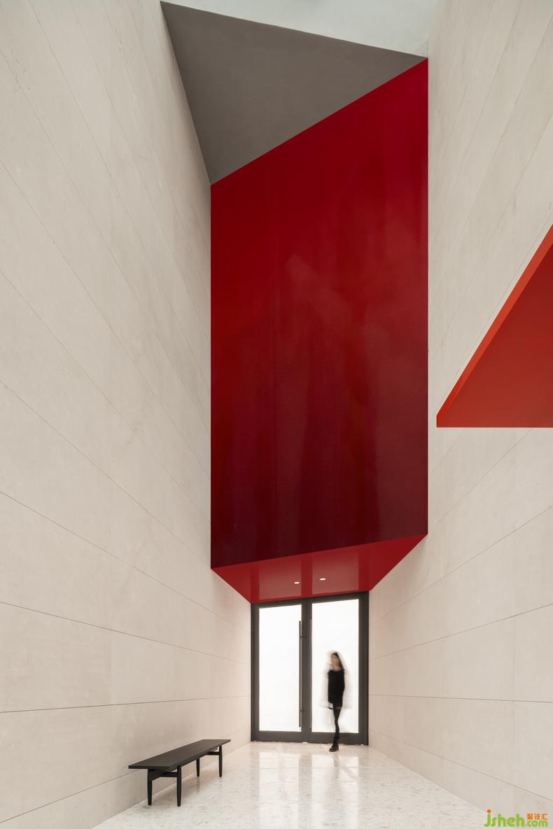 主要材料|紅黑漸層烤漆、米白手工漆、藍(lán)色手工漆、白色水磨石、米白大理石、蛇紋石、鋁板、白楓木