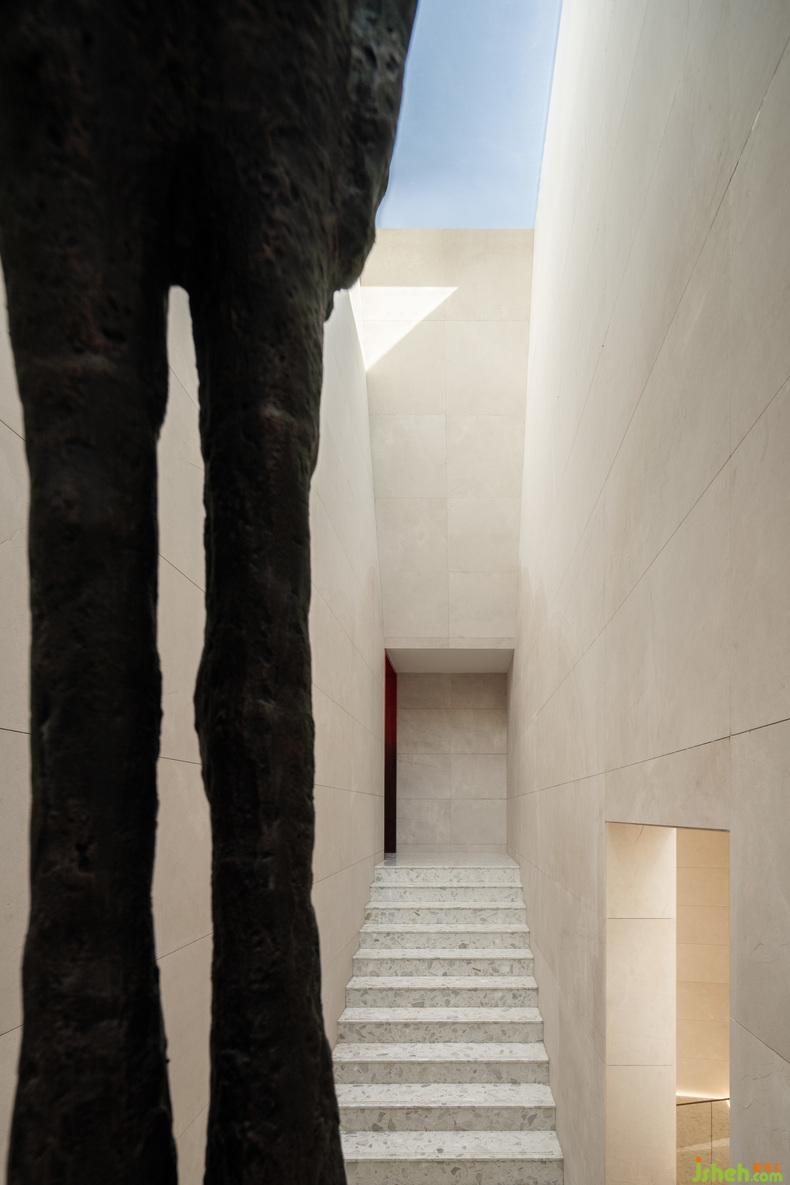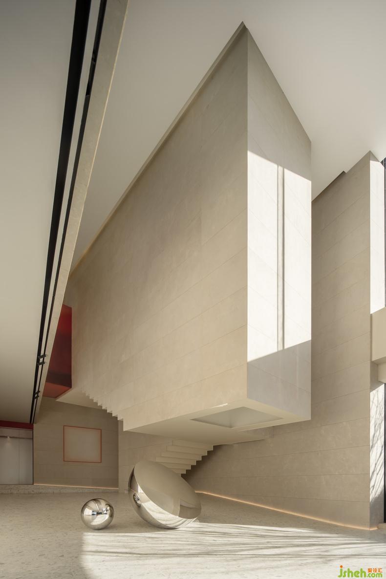 大幅藍色安定了西側咖啡廳,吧臺或底墻,寧靜如靜夜海中黝暗的島嶼,安撫躁動,藝術中心設計使人放心將自己安置其中。飽滿的紅,乍然現(xiàn)身又爽脆地收邊,例如中庭末端延伸向后的飛檐、色域之間的甬道,是路徑上落下的面包屑、畫中的楔子,毋需文字便能引導動線,使人順應直覺探索未知,恰如創(chuàng)作者下筆時不假思索的意念。