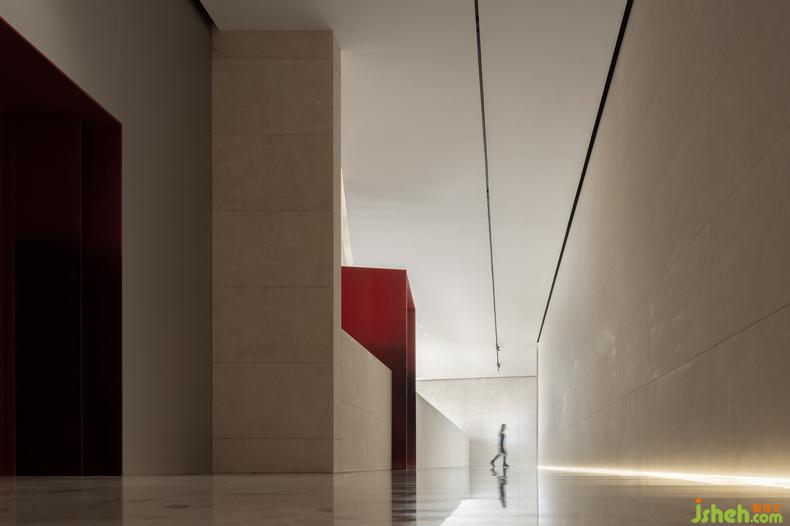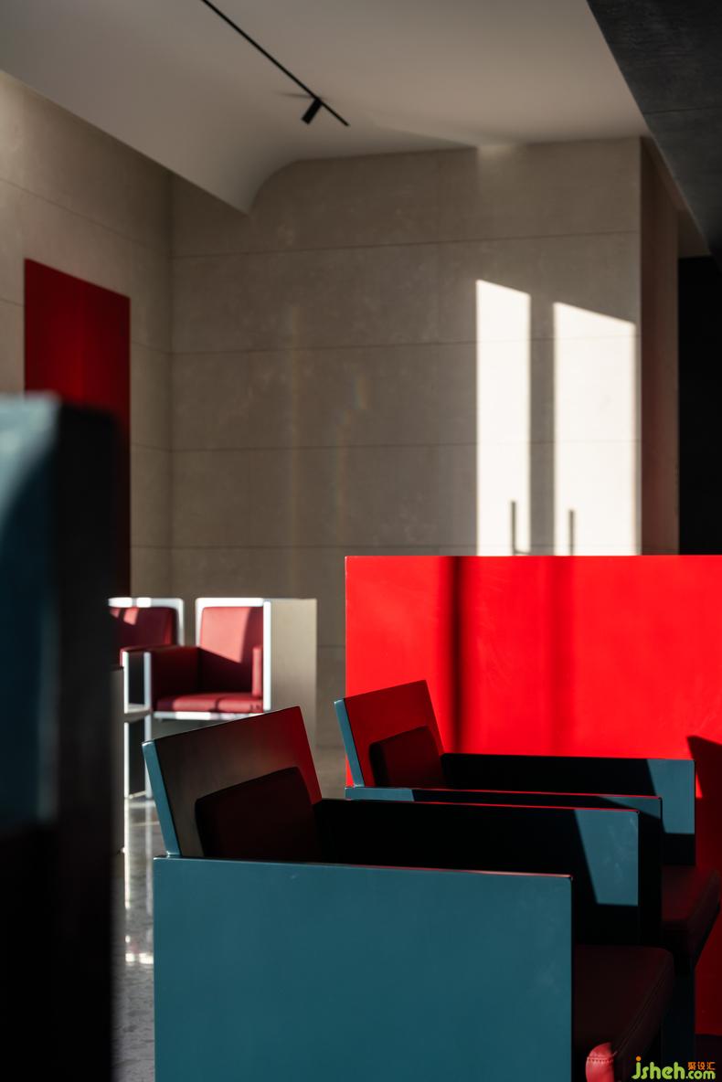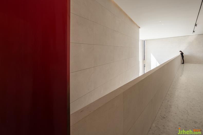 跨越量體的樓梯結(jié)構(gòu),以石灰白和雕塑般切割線展示藝術(shù)質(zhì)地,濃厚的白緩緩相接交疊,模糊筆觸秩序而顯得寫意。藝術(shù)中心設(shè)計(jì)天井下抽空時(shí)間感的白、量體間銜著影子的白,各具性格、超越理性計(jì)算,它們在畫中遼闊無聲,令情緒得以喘息。二樓藝文學(xué)堂則以暖白填滿角隅靜謐,在穿越撼動(dòng)各樣情緒的色域、離開畫作之前,以一段中性空間沉淀統(tǒng)合飽滿的感受。