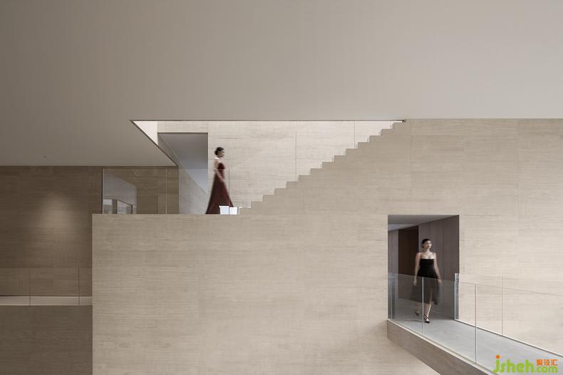 為強化量體搭接、挑空挑戰(zhàn)視覺穩(wěn)定感,選擇質厚的洞石,表面經(jīng)特殊處理保留孔隙及邊緣不盡筆直的切割線,恰如時間對建筑的消磨與積累,是工業(yè)器械難以仿造、處在過往與未來之間的未竟之美。