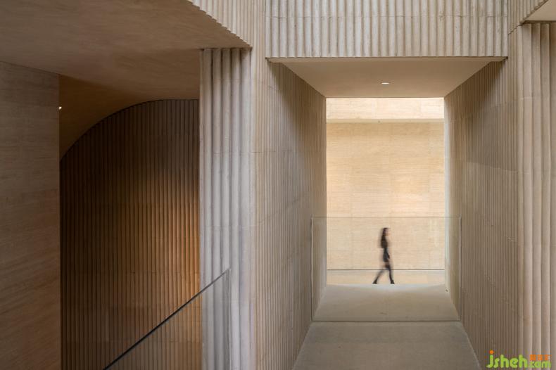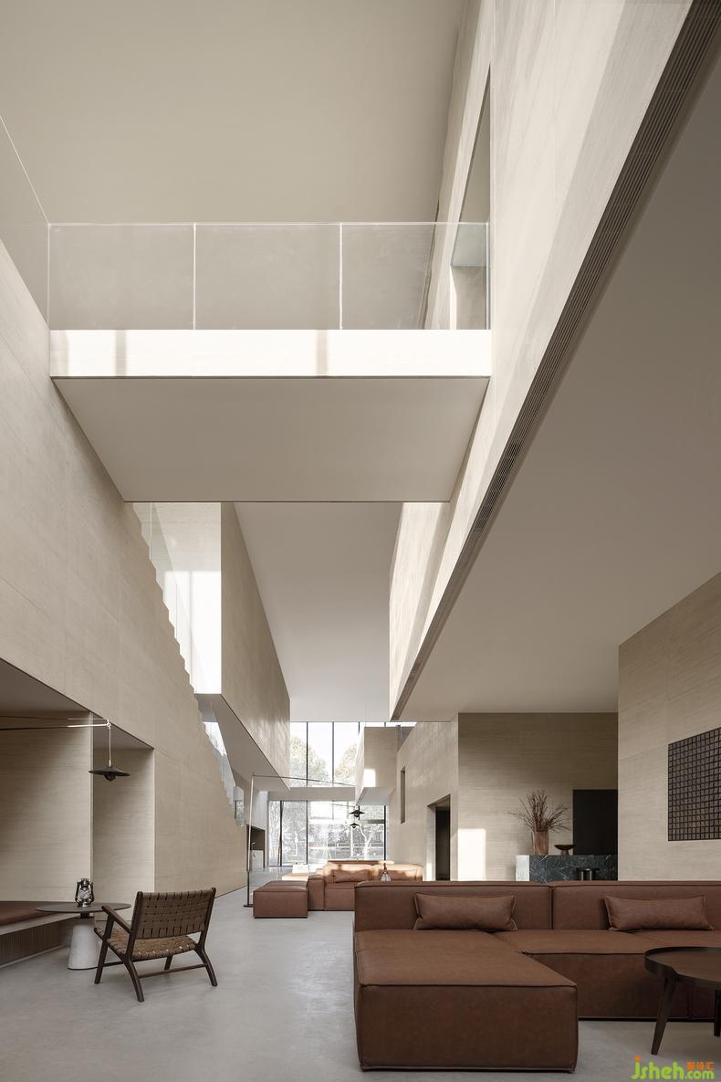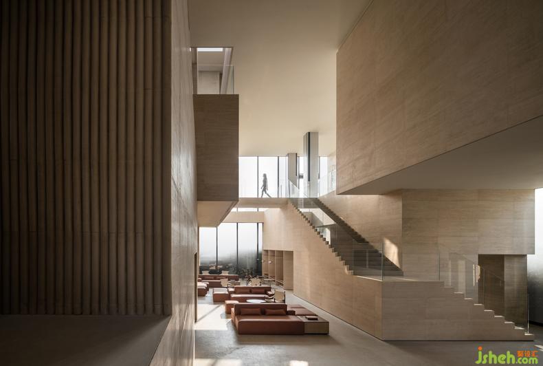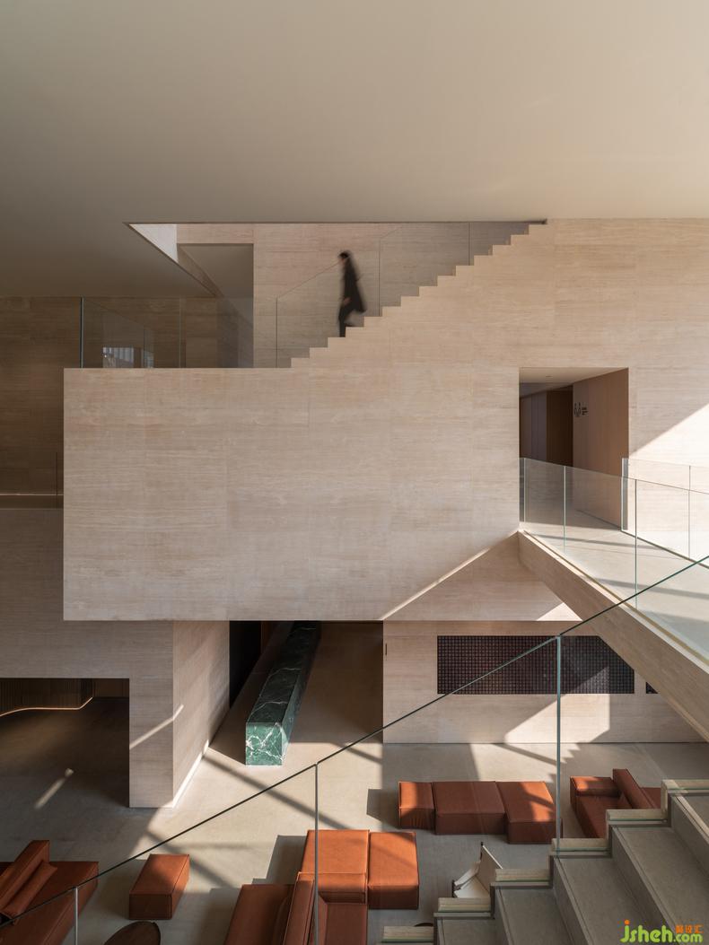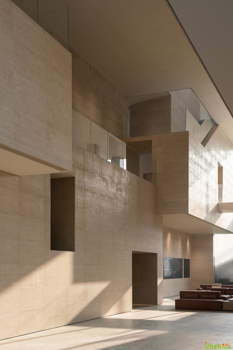 藝術(shù)館設(shè)計的理念通過物與物之間的關(guān)系得以表現(xiàn)。二樓深度洽談區(qū)的軟裝設(shè)計和一樓遙相呼應(yīng),互通有無。一樣的以磚紅輔以典雅的灰棕色調(diào),極簡地表述著相同的故事。精妙之處在于,設(shè)計者為了更能彰顯建筑空間的氣質(zhì),在沙發(fā)的選用上選擇了更建筑材料一樣的石材,再者,從細(xì)節(jié)處以金屬和木飾面作為主要的材料,整個空間靜謐且高貴。