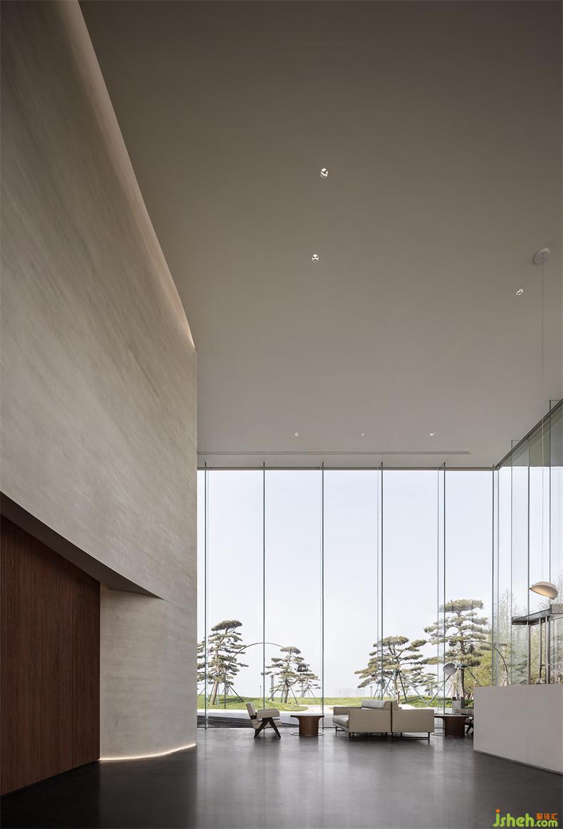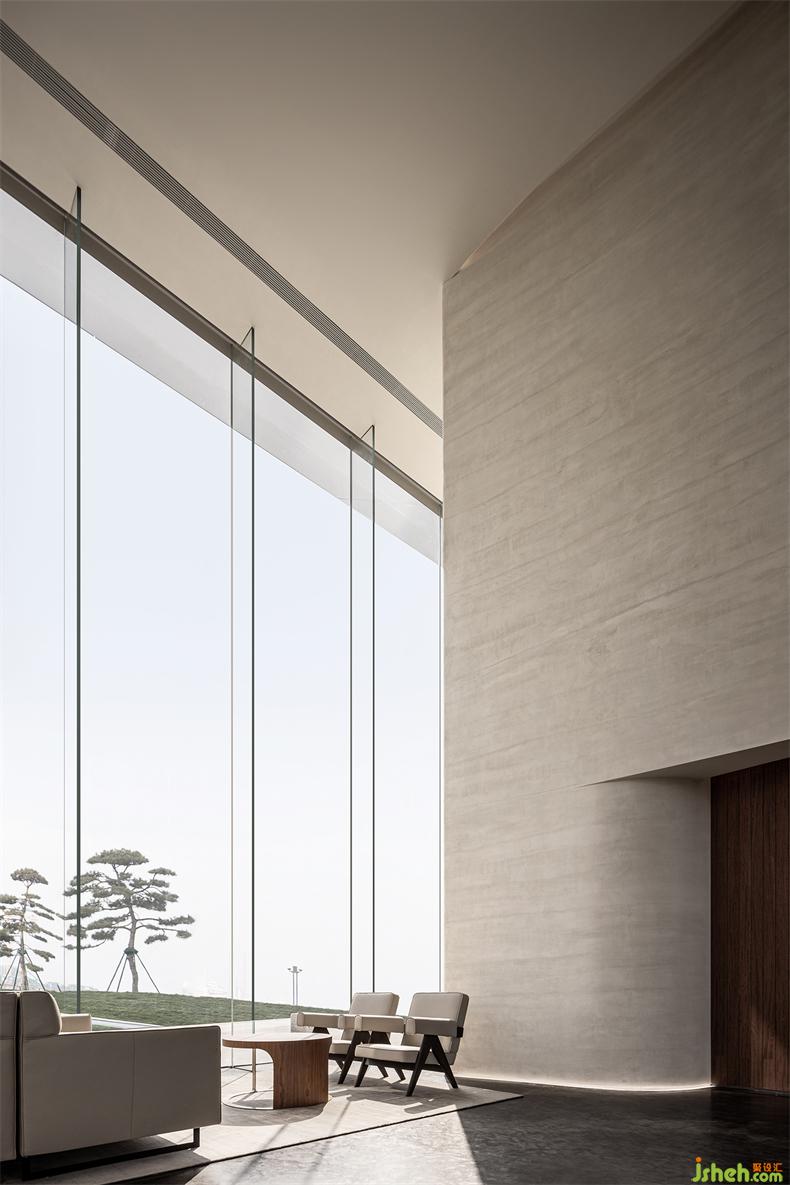 交疊垂直立面兩側(cè)留有臨窗路徑,售樓處設(shè)計(jì)逐漸現(xiàn)身的座位如航行時(shí)望見岸上星火點(diǎn)點(diǎn),旅程中目的地逐漸浮現(xiàn),漸強(qiáng)和聲引起人們對(duì)后方樂章的憧憬。