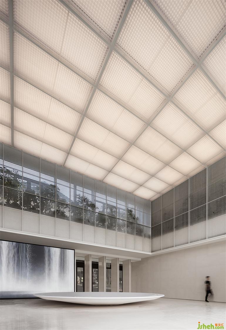 想像踏入建筑即陷入一處多格放映的劇場,相較于喬木真實(shí)在旁的室內(nèi)叢林,售樓處設(shè)計(jì)格柵及噴砂壓克力屏蔽的枝葉,因切割而輪廓離散如二維圖像,經(jīng)由一格格數(shù)碼編排序出幻境,引人好奇:網(wǎng)格內(nèi)的枝葉將以自然抑或數(shù)碼形式生長演化?