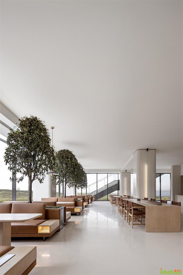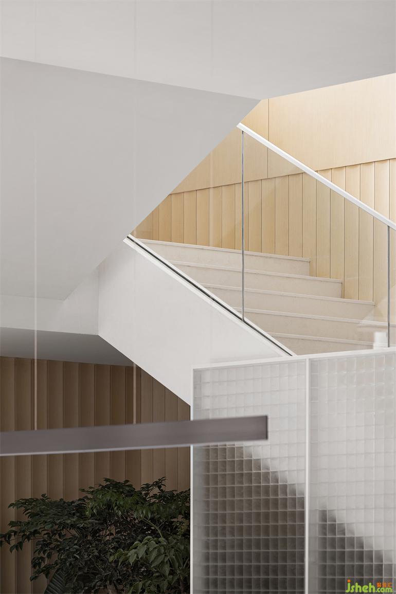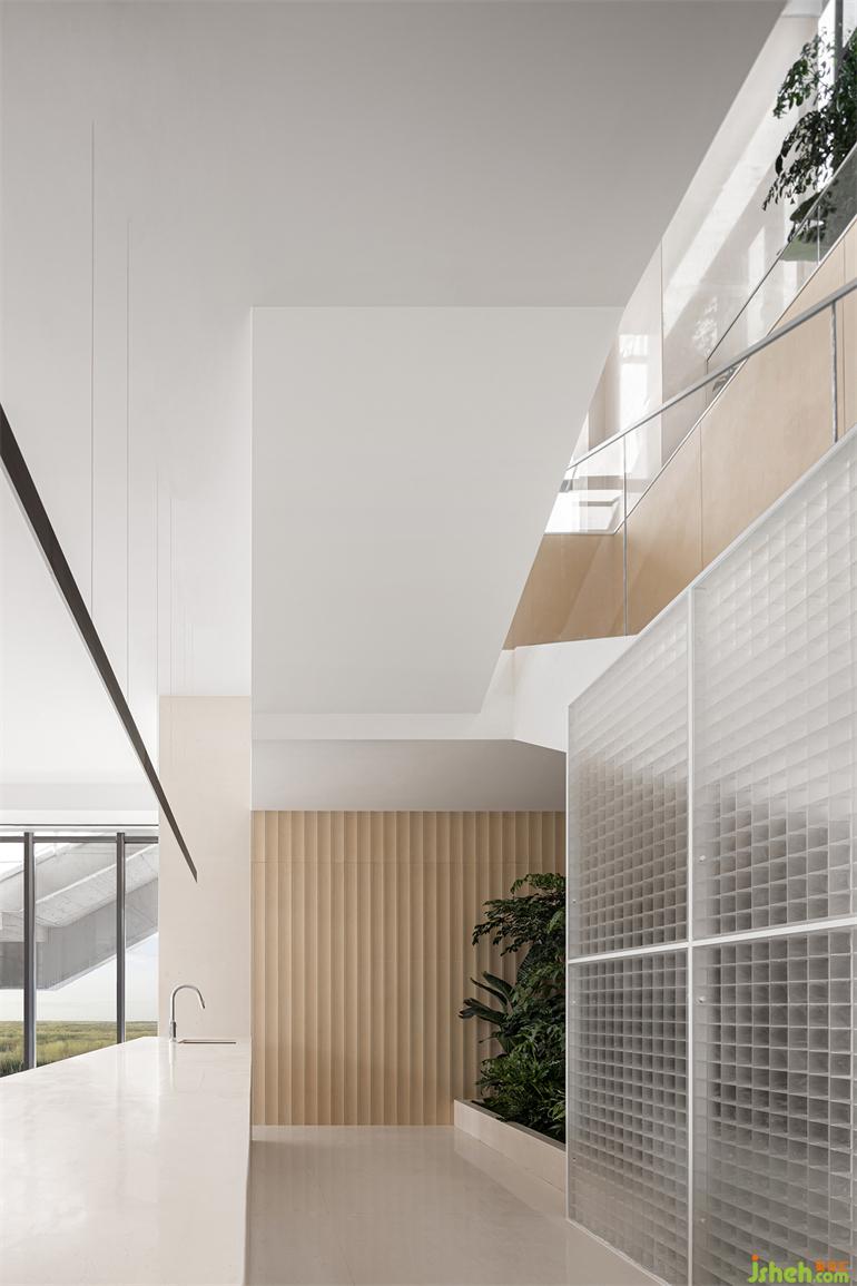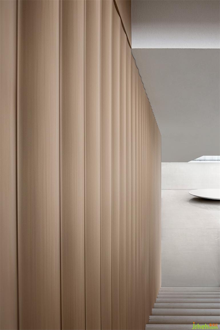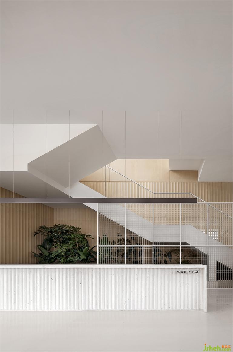 長時間的靜態(tài)活動藏于量體內(nèi)部,釋放開闊場域給串接、流動的短暫行為,有別于格柵產(chǎn)生的網(wǎng)格影像,橋梁上的片刻動態(tài)是更銳利、穿透的,如此一幕幕層疊出景深。無論身處哪一事件場景,目光總會停在中央似長幅屏幕的格柵,售樓處設計節(jié)錄一幕又一幕生活的段落,遺忘了起頭、尋不著結尾。
