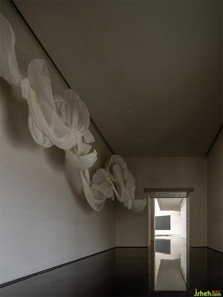 白色織品于壁面飛騰的凝結(jié),裝修設(shè)計像狂草連綿的放縱,亦如漁民在清晨江心拋灑漁網(wǎng)一瞬,人世間所有變動與燦爛,終將在山水間歸于靜定無波。用絲線懸垂勾勒出縹緲自然的紡織裝置形態(tài),彰顯一種即興的、無意識的表達狀態(tài),又恰似水墨入紙的一瞬間,空靈灑脫。