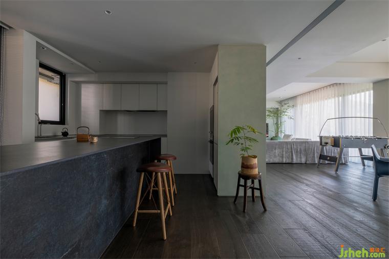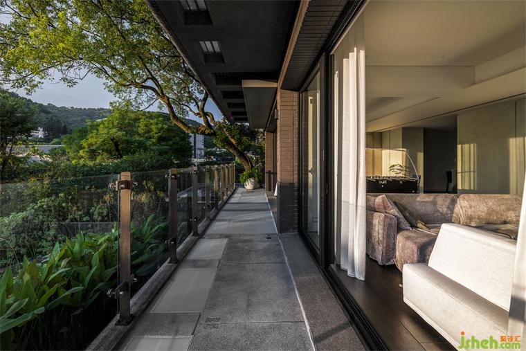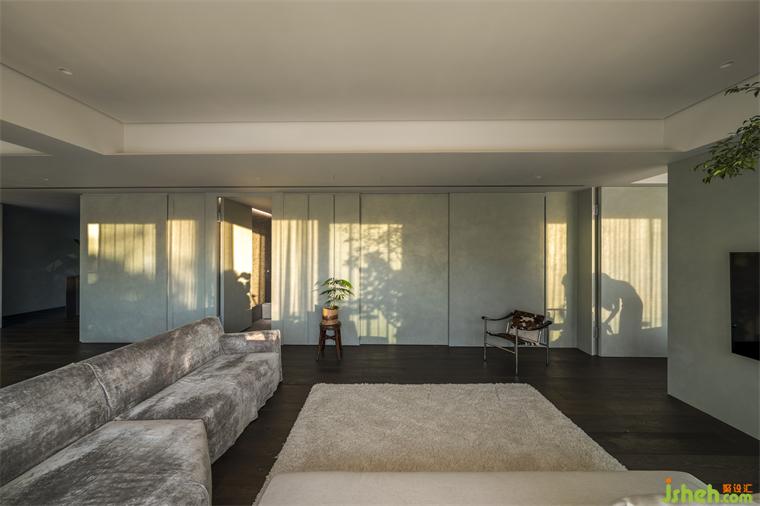 本案長型基地一側(cè)擁有連貫窗景和帶狀露臺,住宅設(shè)計熟悉山林的屋主遷至市郊生活仍擇鄰近故宮、一處有山有溪的住所,希望自然曾經(jīng)帶給他們的情懷能在此繼續(xù)生長。我們將起居環(huán)境視為呼應(yīng)戶外溪林的文本,企圖在故宮藏品間找到表現(xiàn)空間的調(diào)子。