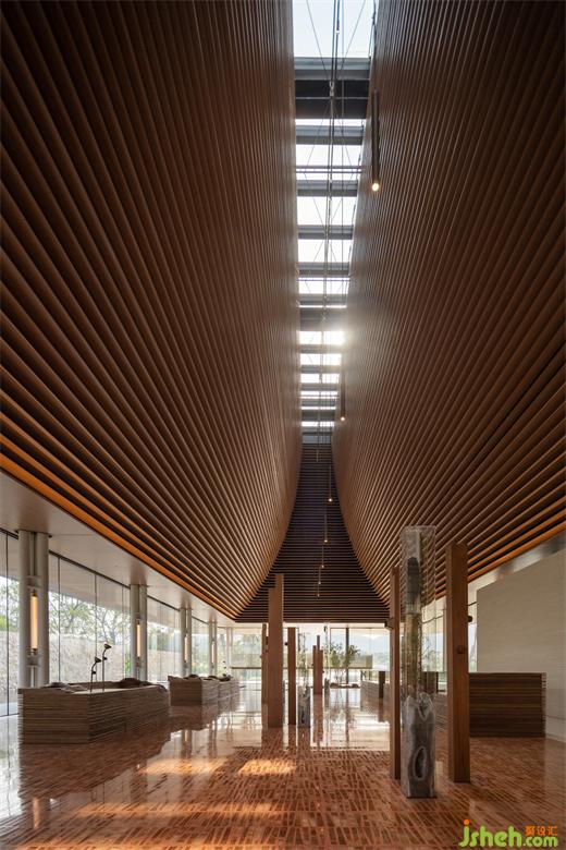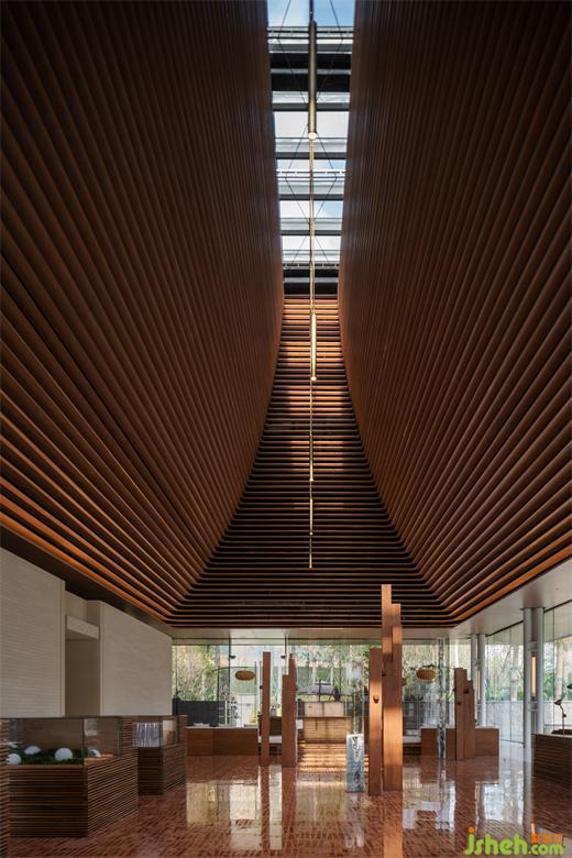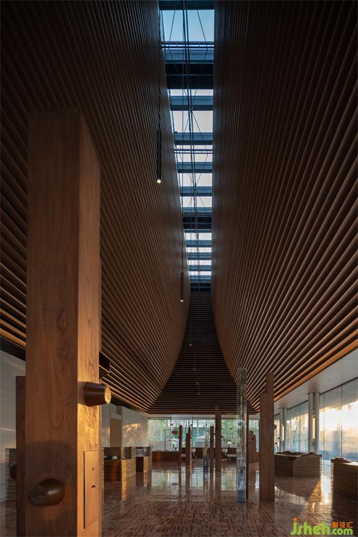 當(dāng)業(yè)主方需三座館舍架構(gòu)起中心,南島水岸特有的船屋畫面激發(fā)靈感,與建筑單位共同討論后舍棄冷硬框架,體驗(yàn)館裝修設(shè)計(jì)選擇融合當(dāng)?shù)孛缱濉妇勐涫健菇ㄖ鷳B(tài),包括內(nèi)外界線模糊的皮層、坡屋頂輪廓,有助空氣對(duì)流,也連結(jié)傳統(tǒng)屋宇順應(yīng)環(huán)境的姿態(tài)。