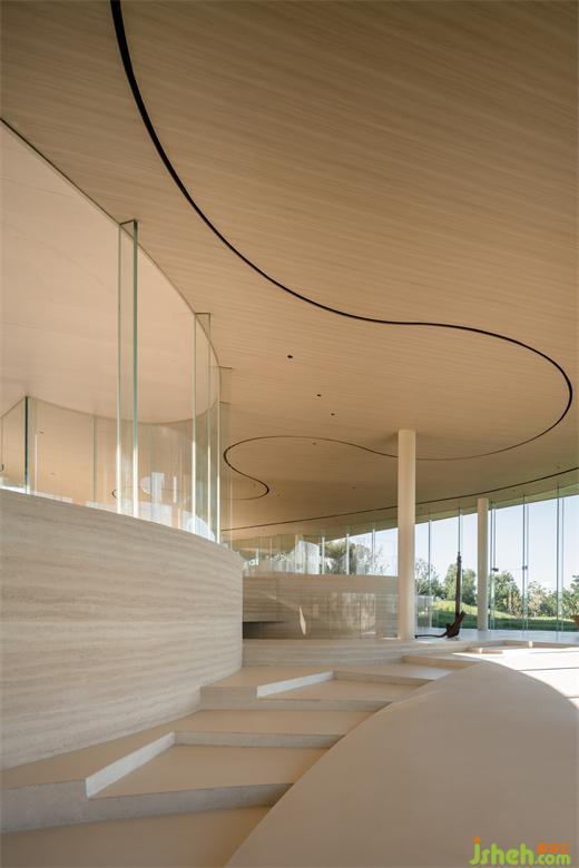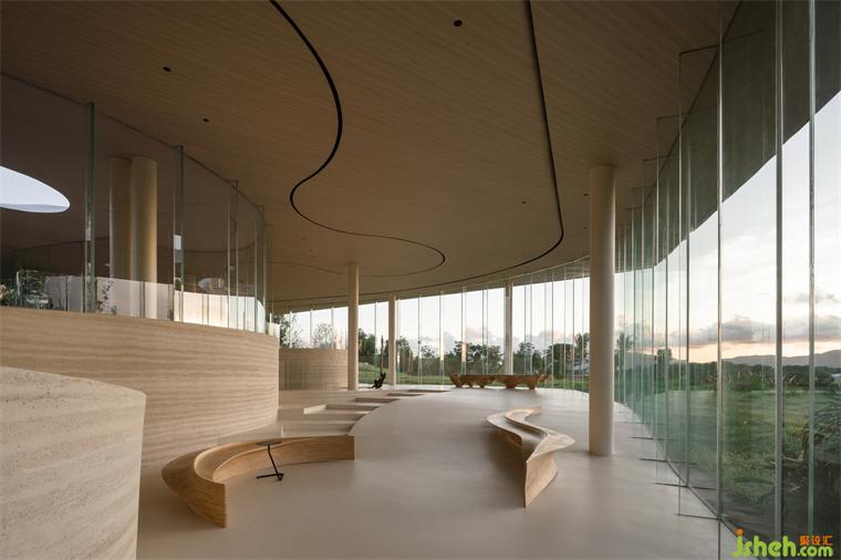 如此模糊水平基準面的做法,加上窗外地景延伸的景深,生態(tài)公園設計使空間呈現(xiàn)一種漂浮、無序的流動狀態(tài),呼應河水奔流的動感。