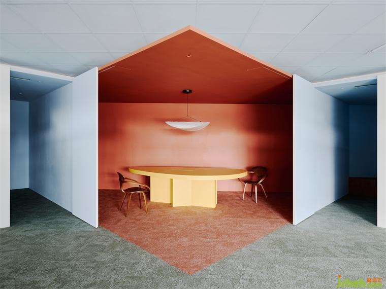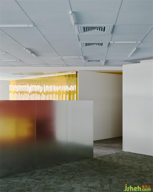 為了在有效的成本控制中做出質(zhì)感,設(shè)計師也利用大量的原始材料,例如夾板染色取代貼木皮、鍍鋅板直接做隔間墻、地板選用色塊地毯,因為這些都是趨近于本質(zhì)的材料,毋需額外貼附材質(zhì)修飾,辦公室設(shè)計包括原辦公室的輕鋼架也僅用色彩改變原先質(zhì)地。