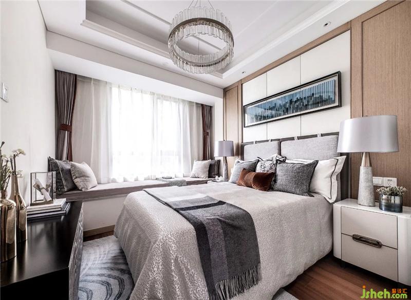 The overall space of the master bedroom is actually not large. The spacious bay window and the bedside wall are just right. Because of the vertical wood veneer background wall symmetrical design, even if the ceiling is ceiling and plaster line, the space will not be crowded.