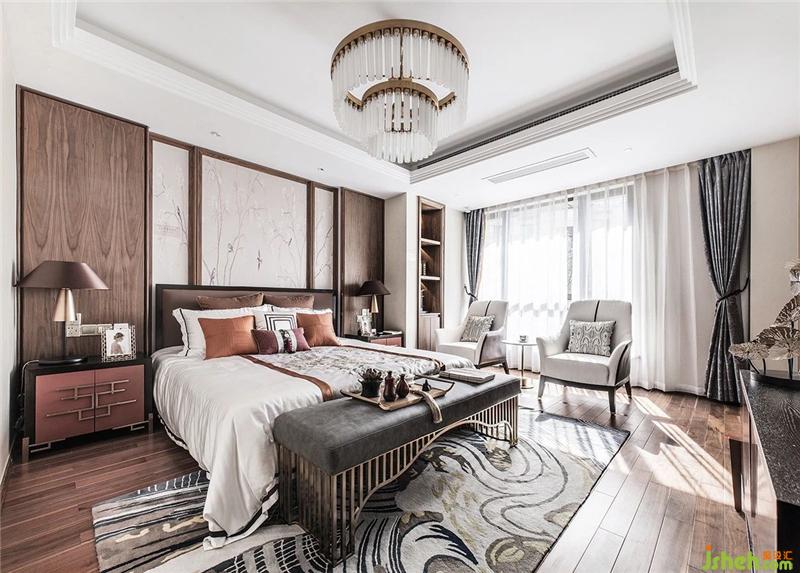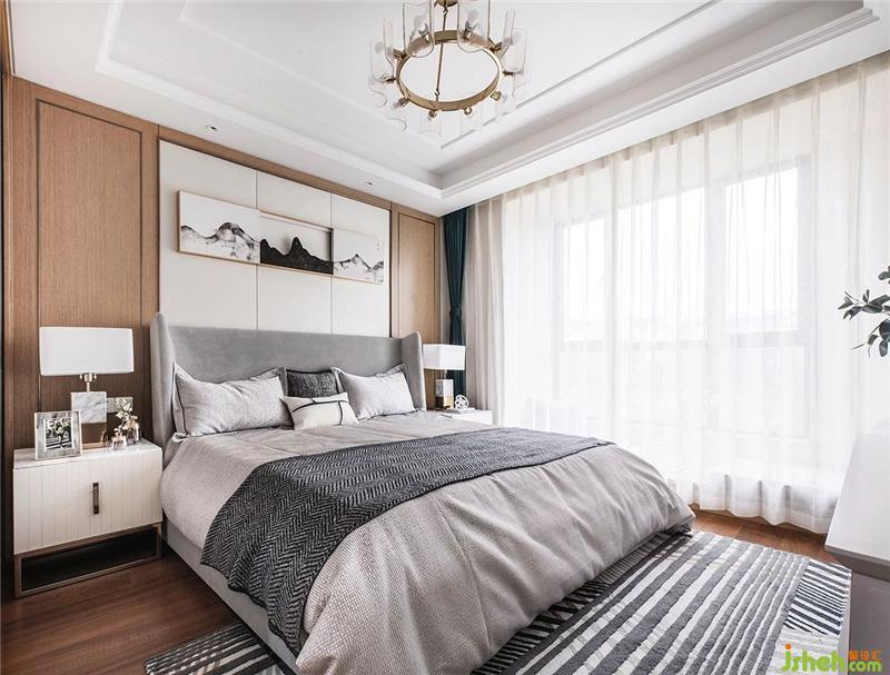 The bedroom refines the Chinese elements in the details and simplifies and enriches them. The wooden background wall is decorated with Chinese wallpapers. The lines make the space more stable and elegant. The language language is used to express the cultural connotation and create an extraordinary visual tension.