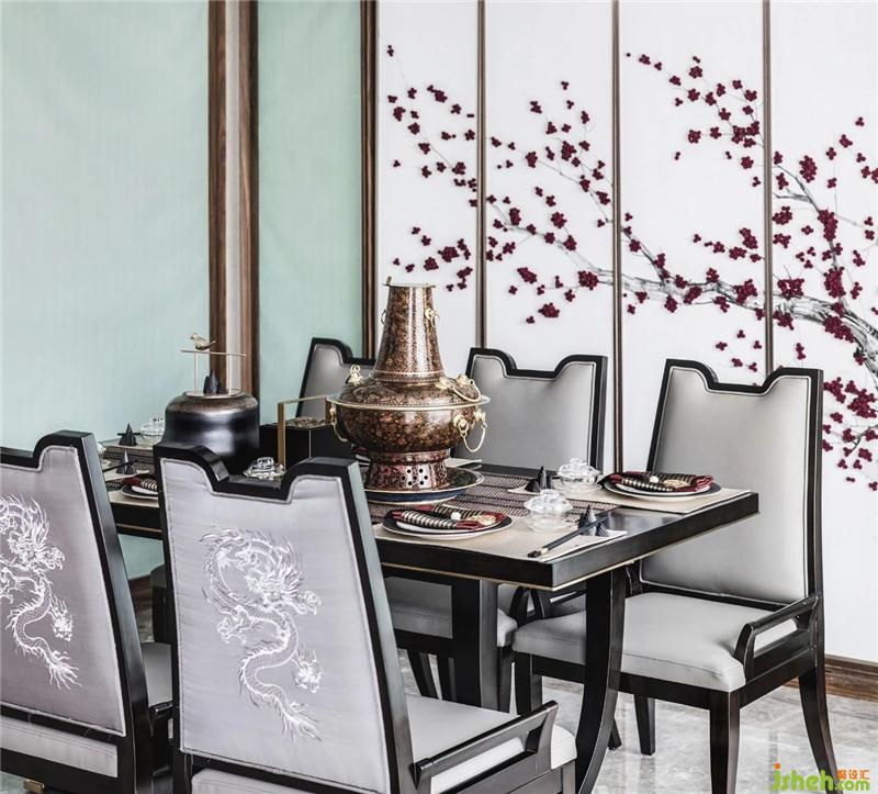 The new Chinese style is the overall style trend, the space is dotted with a few pieces of light green, the restaurant wall decoration flowers, and the unique charm of the East. The lines of space are mostly square. The perfect combination of lighting, floor-to-ceiling windows and hidden ceiling lights, pure white as the main color of the space, accompanied by Chinese furniture, to create a style and grace, elegant and quiet.